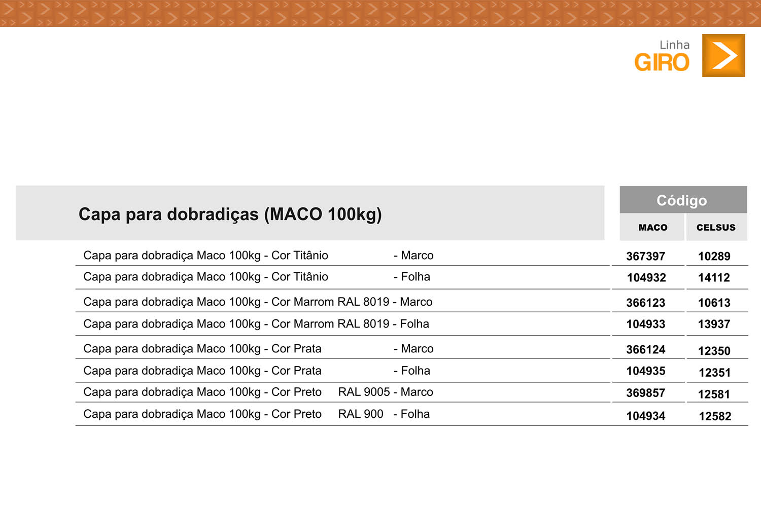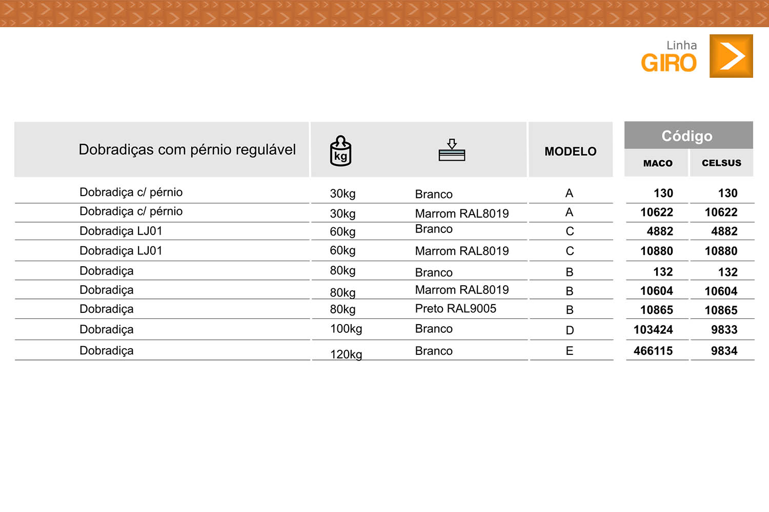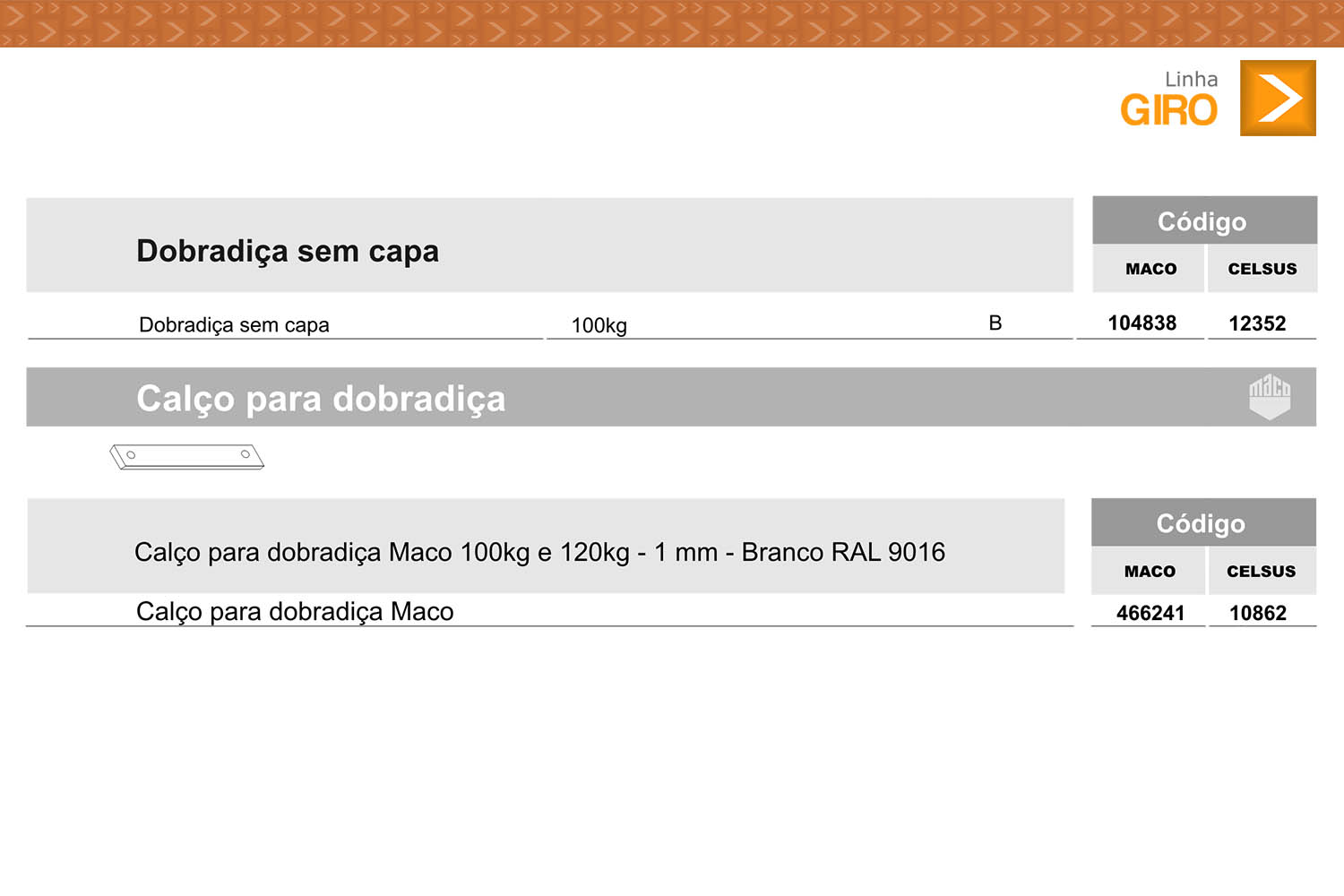 Dobradiças com pérnio regulável, dobradiça sem capa, calço para dobradiça e capas para dobradiça.